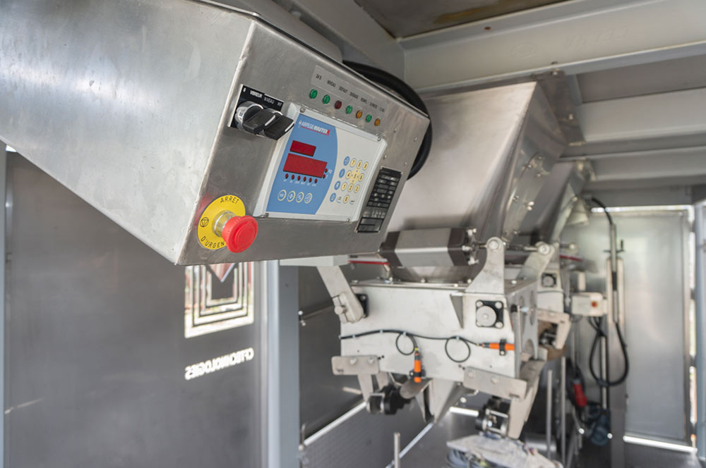 L’étage supérieur contient la trémie, le groupe électrogène, le compresseur ainsi que les doseuses pondérales grande précision 18/22 g par sac.