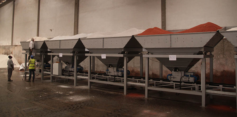 Les matières premières sont réparties dans chaque trémie pour ensuite être pilotées selon la formule demandée dans le programme. A la mise en route du système, chaque trémie déverse sur le tapis la dose requise progressivement. Les engrais tombent dans une vis de mélange afin de rendre la formule homogène et ainsi être ensachés ou stockés en vrac. Le mélangeur Melix 5 a une capacité de production optimale de 150 t/h notamment grâce à son système d’automatisation Siemens.